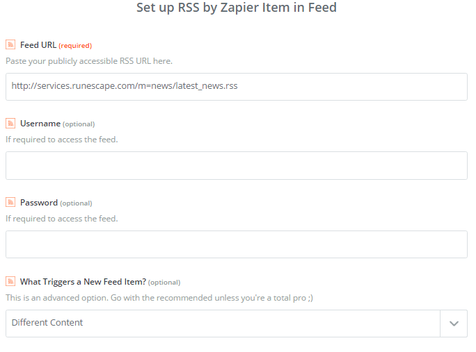In the Feed URL enter the url of the feed you would like it to post from. Then for the trigger, select different content.
