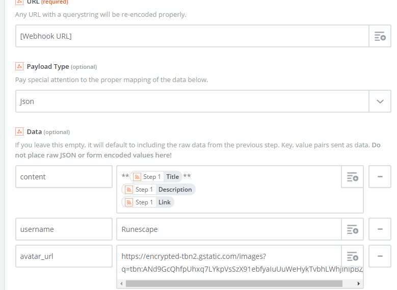 Fill in the template as shown below. Make sure to use the webhook URL we got from Step 2. Also, in the "Data" section, you can edit the fields, but don't edit the names of the fields, or Discord might not accept the input.